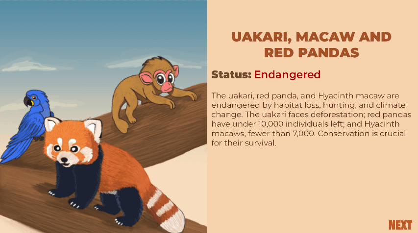The primary challenge was to create a game which also acts a way to spread awareness on the five most endangered species, Uakari, Red Pandas, penguins, polar bears, in a fun yet educational way, this where Wildlife Wanderer stemmed from. To achieve this I did some research on what biomes had most endangered animals and found that some where in same biomes, as this was for level designs, through the game player has collect all the endangered animals and upon finishing each level, the player is greeted with statistic and fun facts about specific endangered species, making playing fun yet still educational.